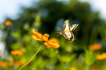 A beautiful yellow butterfly is flying to suck the nectar of a beautiful yellow cosmos flower blooming in a forest garden with a blurry green bush in the background.
