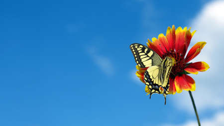 colorful Swallowtail butterfly on red Gaillardia flower. copy space