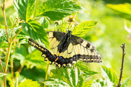 Swallowtail butterfly in foliage of berry bushes on a sunny summer day
