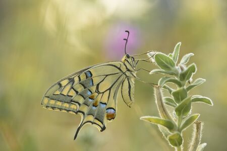 Presious and beautiful Swallowtail butterfly (Papilio machaon) feeding on a Purple flower. Blurry green and yellow background. Summergarden.