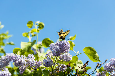 bright colorful swallowtail butterfly on purple lilac flowers in the garden