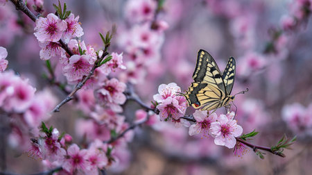 A stunning close-up image of a butterfly resting on pink cherry blossom petals, capturing the essence of spring and the beauty of nature in a tranquil garden setting.