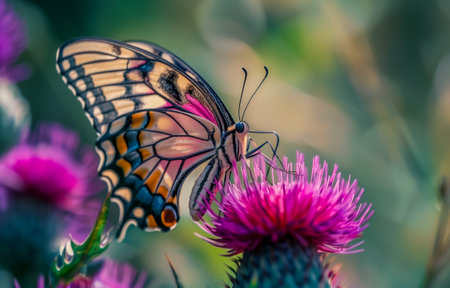 Vibrant butterfly pollinates purple blossom in tranquil scene generated by artificial intelligence