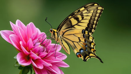 Swallowtail butterfly flying around pink flower and yellow background