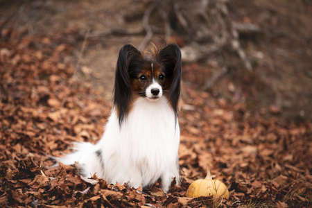 Portrait of Cute dog breed papillon sitting on the falling leaves in the forest in autumn