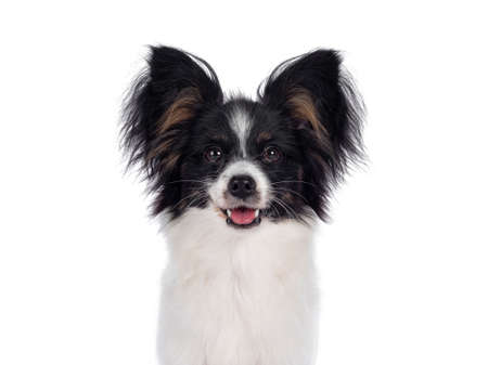 Head shot of excellent white black and tan Epagneul Nain Papillon dog puppy, standing facing front. Looking towards camera. isolated on white background.