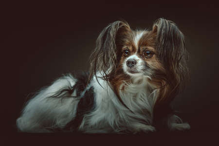 Adorable Papillon Dog. Studio shot. Moody dark lighting, dark background.
