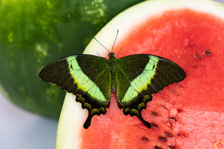 Bright and juicy butterfly on a watermelon. Papilio palinurus. Green butterfly on a red watermelon