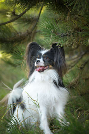 Portrait of beautiful white and brindle dog breed papillon lying under the tree in the forest in summer. Continental toy posing outdoors at sunset