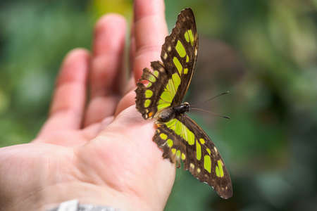 Close up butterfly on woman hand. Beauty of nature.