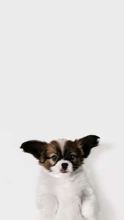 Attented. Papillon Fallen little dog is posing. Cute playful brown doggy or pet playing on white studio background. Concept of motion, action, movement, pets love. Looks happy, delighted, funny. Flyer