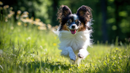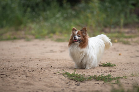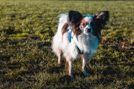 Papillon dog in the grass in a large field. Portrait of a brown and white Papillon enjoying a walk.