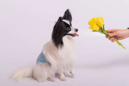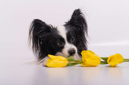 Cute and funny little papillon dog with a tulip. Adorable Toy continental spaniel dog is sniffing a flower. Happy day