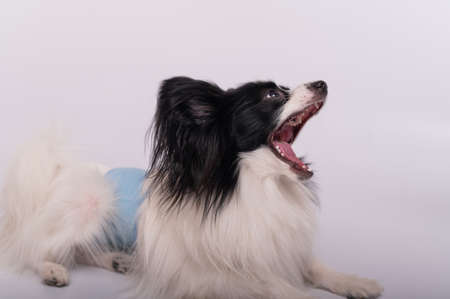 Portrait of a cute dog Continental Spaniel in a males hygiene belt. Papillon is wearing a diaper against territory markings and urinary incontinence