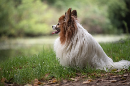 Papillon is sitting in the grass. It is autumn portrait.