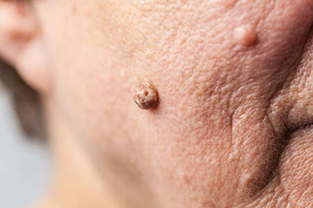 Neoplasm - human papillomavirus on the face of an elderly man, small selective depth of field, defocus, close-up of skin and pores on the surface in the upper part of the cheek.