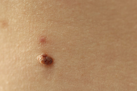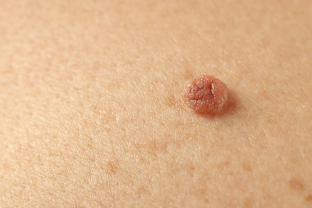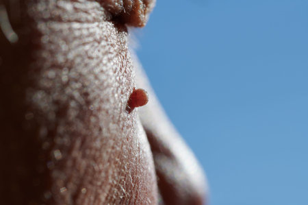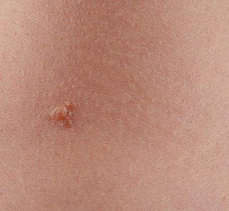 Close Up photo of skin tag or skin mole on a human body before medical dermatologist treatment with liquid nitrogen. Skin mole tag removal. Dermatological beauty treatment