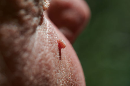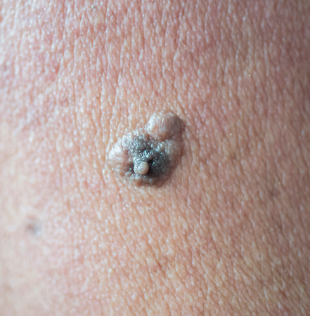 Close Up photo of skin tag or skin mole on a human body swollen and enlarged from the medical dermatologist treatment with liquid nitrogen. Skin mole tag removal. Dermatological beauty treatment