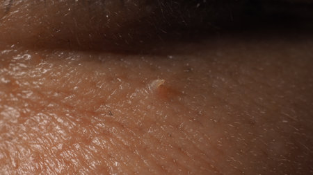 Wart skin removal. Macro shot of warts near eye on face. Papilloma on skin around eye nose and neck. Birthmark Papilla or mole on skin. small hard. benign growth on the skin caused by virus. Skincare