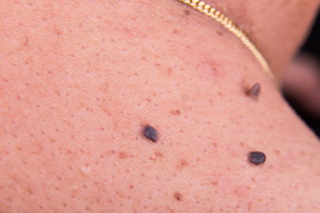 Unrecognizable person having dark fibroma, dermatology problem on skin. Close up of papilloma dermatosis
