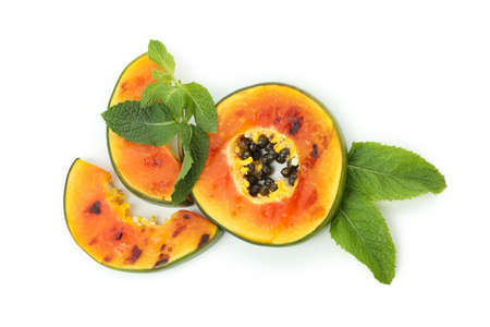Isolated two halves of papaya fresh tropical fruit on white background. High quality photo