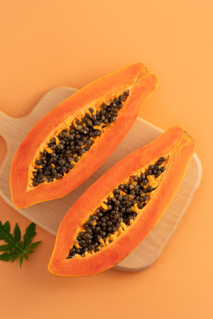 Ripe papaya fruit cut into half on orange background. Summertime concept.