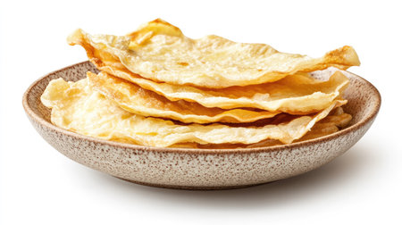 A close-up of a papadum, with a thin and crispy lentil wafer, served as an appetizer, isolated on clean white background.