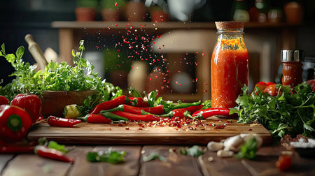 A vibrant kitchen scene showcasing fresh vegetables and spices on a wooden board, with a bottle of sauce, creating an inviting culinary atmosphere.