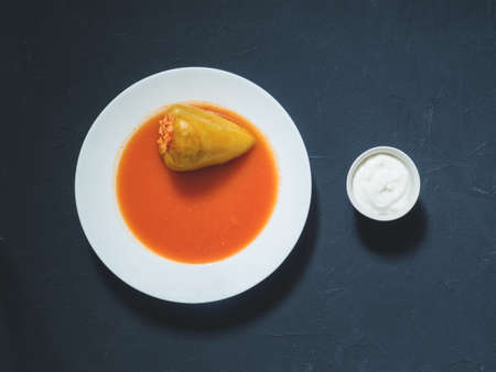 Stuffed pepper in a white plate with sour cream on a black background. Flat lay, top view, copy space
