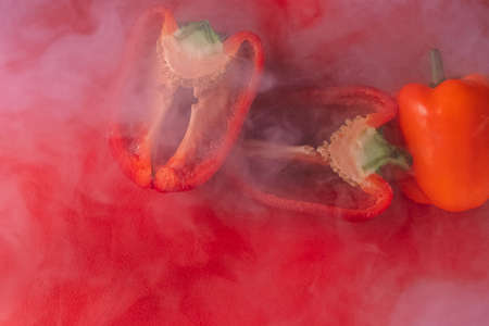 SWEET, fresh RED PEPPER ON A RED BACKGROUND, cut in half, thick smoke around. proper nutrition. fresh vegetables