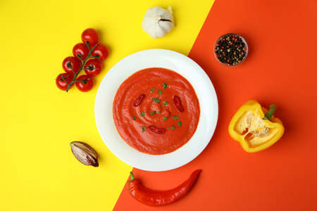 Gazpacho soup and ingredients on two tone background