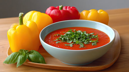 A delicious bowl of fresh tomato soup garnished with chopped herbs sits on a wooden tray alongside vibrant bell peppers, perfect for a healthy meal.