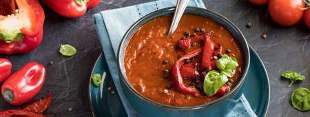 A close up view of a bowl of roasted red pepper soup garnished with roasted red peppers and basil.