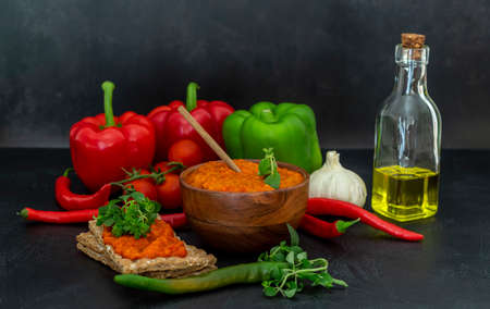 Roasted Red Pepper Relish ajvar or aivar. traditional Balkan vegetable caviar, lutenitza, pingjur with ingredients.