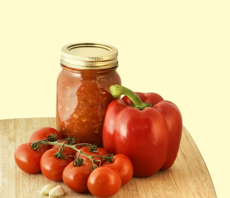 Yummy homemade spaghetti sauce preserve, tomatoes, red pepper and garlic on warm tone background.