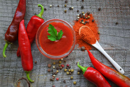 Freshly prepared Hot chilli Sauce close-up on the table. selective focus