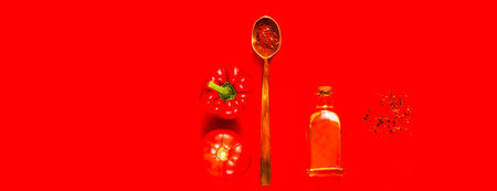 Pepper. Bright red sweet peppers on dark background. Spice in wooden spoons. Flat lay, free space for text