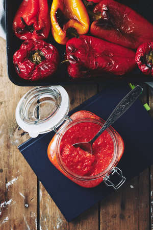 Selective focus of Serbian Roasted Red Pepper Sauce Ajvar. Traditional autumn Balkan relish.