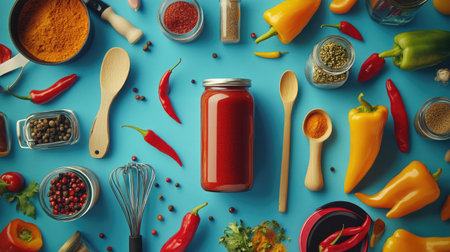A vibrant flat lay of assorted cooking ingredients, featuring various peppers, spices, and a jar of sauce, perfect for culinary arts and recipe inspiration.