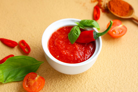 Bowl of tomato sauce with basil and chili pepper on brown background
