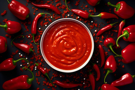 An AI generated illustration of a bowl ketchup surrounded by fresh red peppers
