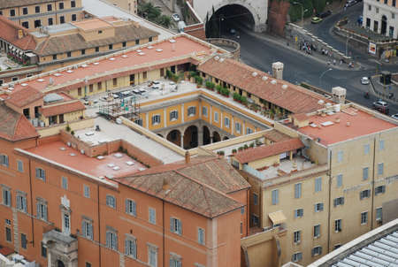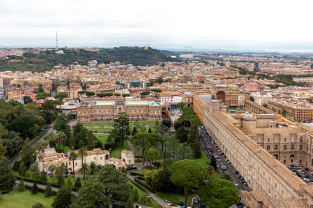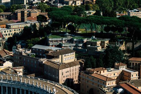 Aerial view of the buildings and garden in Vatican from the roof of The Papal Basilica of St. Peter in Vatican city, Italy