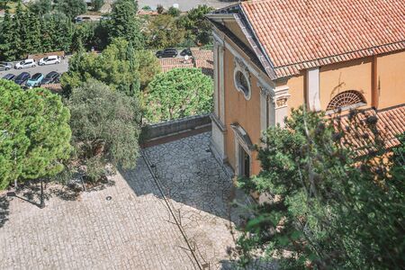 Overhead aerial drone shot of red brick villas in Castel San Pietro, Veronetta, Verona, Italy