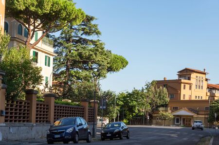 Rome, Italy - September 29, 2019: Lovely quiet street on Aventine hill. Parked cars, beautiful Italian stone pines near houses on blue sky background. No people.
