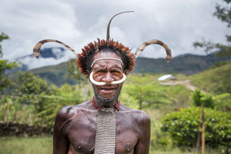 Baliem Valley, West Papua, Indonesia, February 2016: dani tribe man in traditional outfit