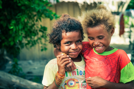 Yenbuba village, Indonesia - June 2015: Two native girls dressed in colourful clothes smile happily and hug at Yenbuba village at Mansuar Island, Raja Ampat, West Papua, Indonesia. Documentary editorial.