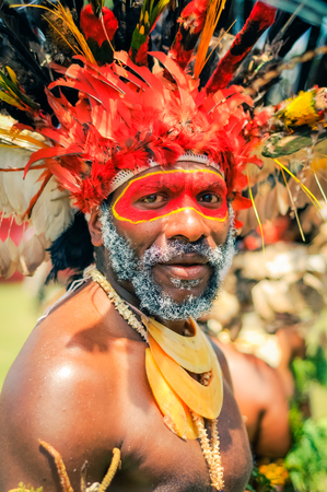 Wabag, Papua New Guinea - August 2015: Native bearded man with necklace, headband and cap with feathers with face covered in red and yellow colours poses and looks to photocamera during Enga cultural show in Wabag, capital of Enga Province, Papua New Guin