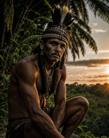 A striking portrait of an indigenous man wearing colorful jewelry and face paint, set against a vibrant jungle backdrop, representing cultural identity.
