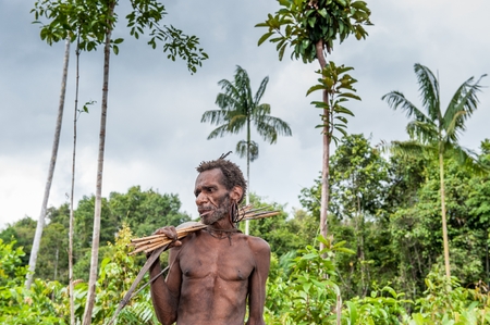 INDONESIA, ONNI VILLAGE, NEW GUINEA - JUNE 24: The Portrait Korowai man hunter with arrow and bow. Tribe of Korowai (Kombai , Kolufo).On June 24, 2012 in Onni Village, New Guinea, Indonesia