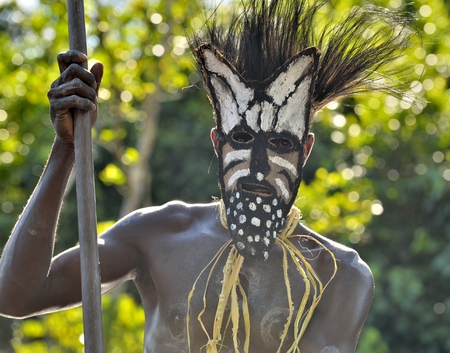 NEW GUINEA, INDONESIA - 2 FEBRUARY: The warrior of a Papuan tribe of Yafi in traditional clothes, ornaments and coloring. New Guinea Island, Indonesia. February 2, 2009.
